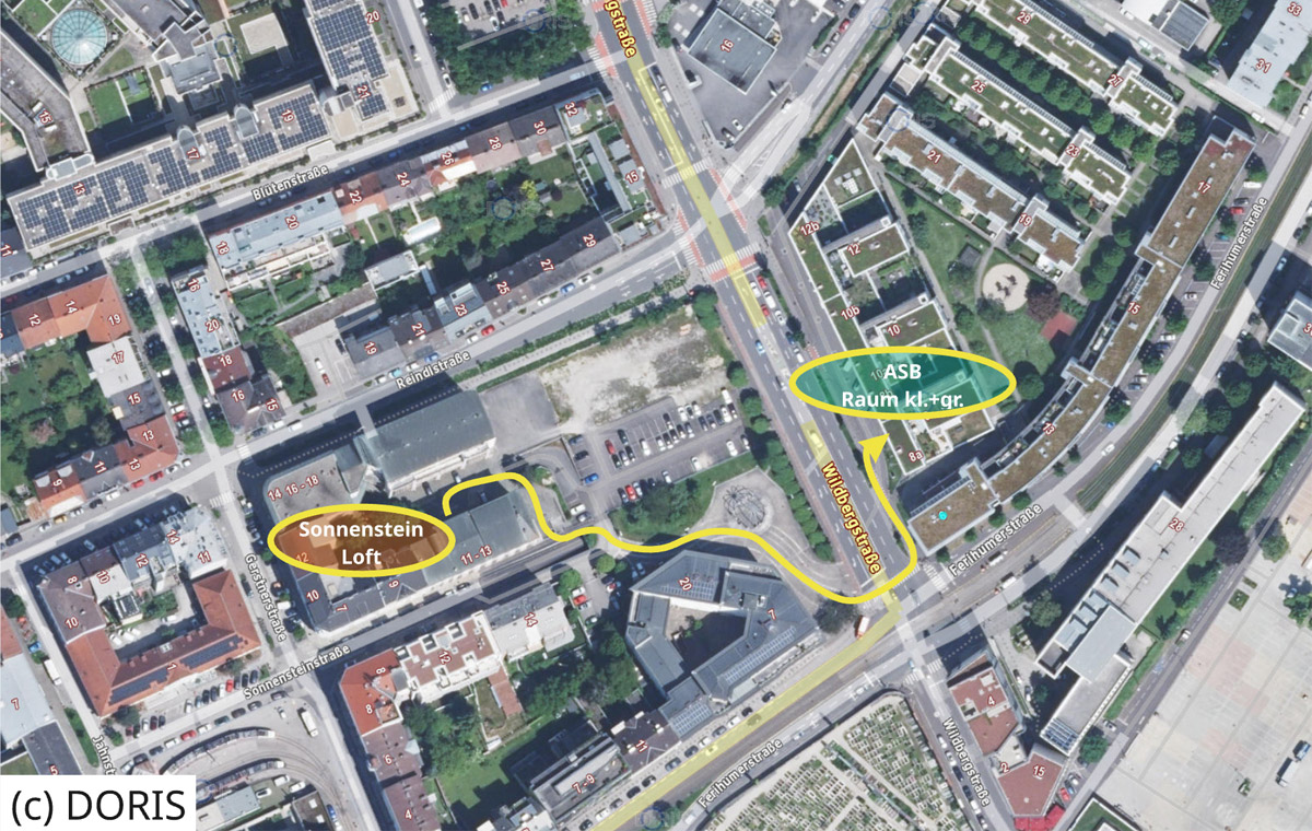 - Vom Eingang Sonnenstein Loft durch den Hof nach rechts auf die Sonnensteinstraße zurück.