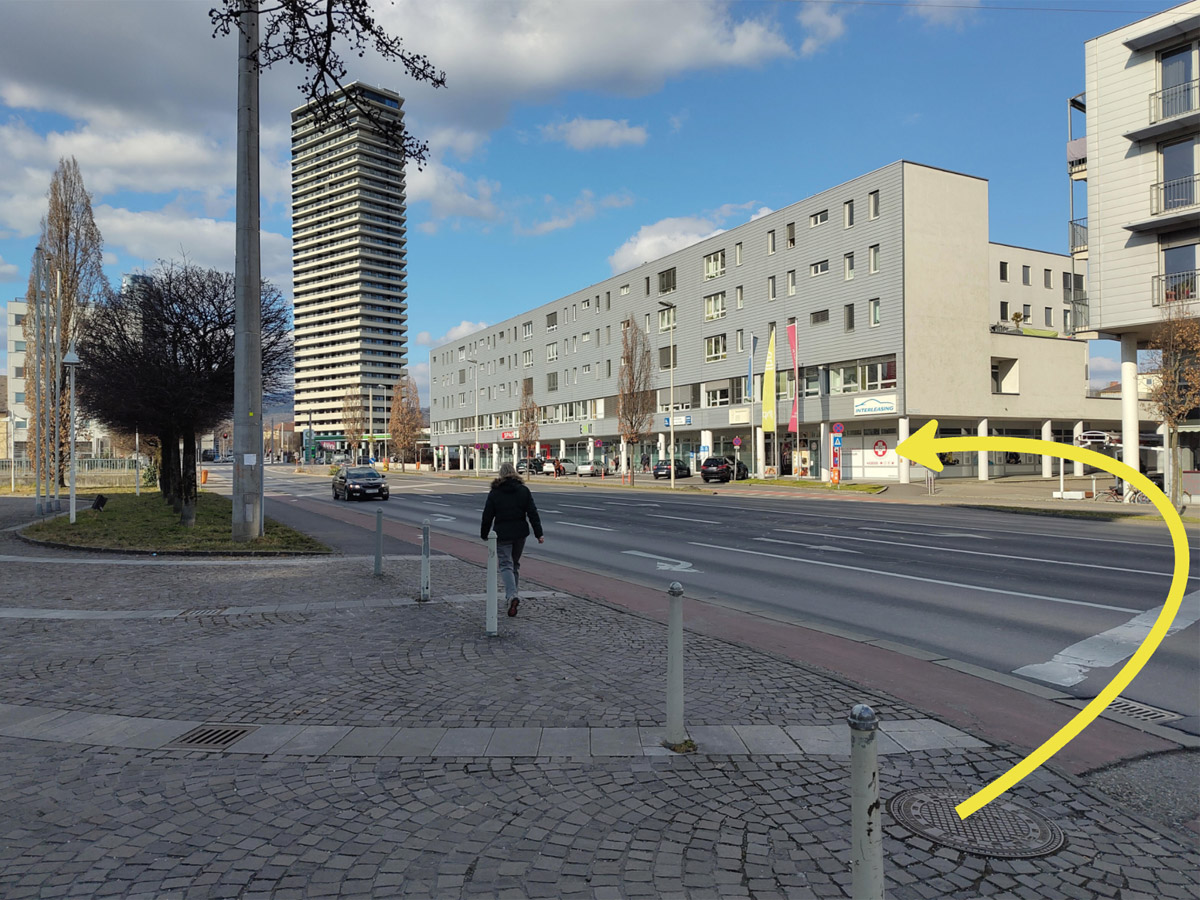 - Rechts am Pavillon vorbei Richtung Straßenbahn gehen.