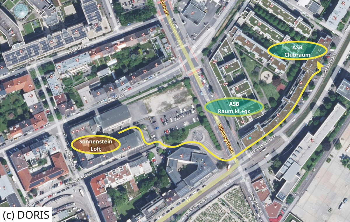- Der Clubraum ist ca. 120 m weiter vorne die Ferihumerstraße entlang (Zugang auch vom Innenhof möglich).