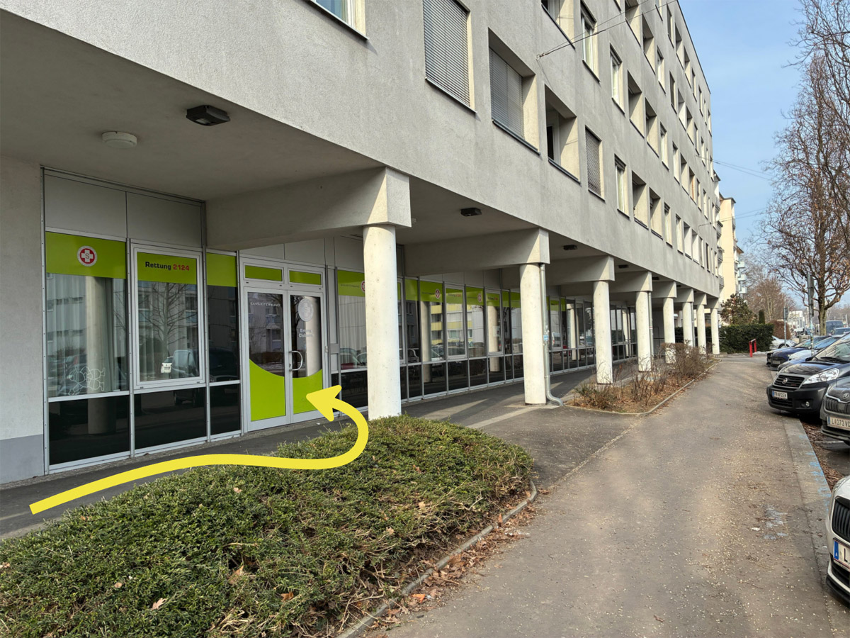 - Rechts am Pavillon vorbei Richtung Straßenbahn gehen.